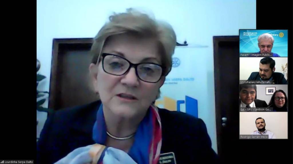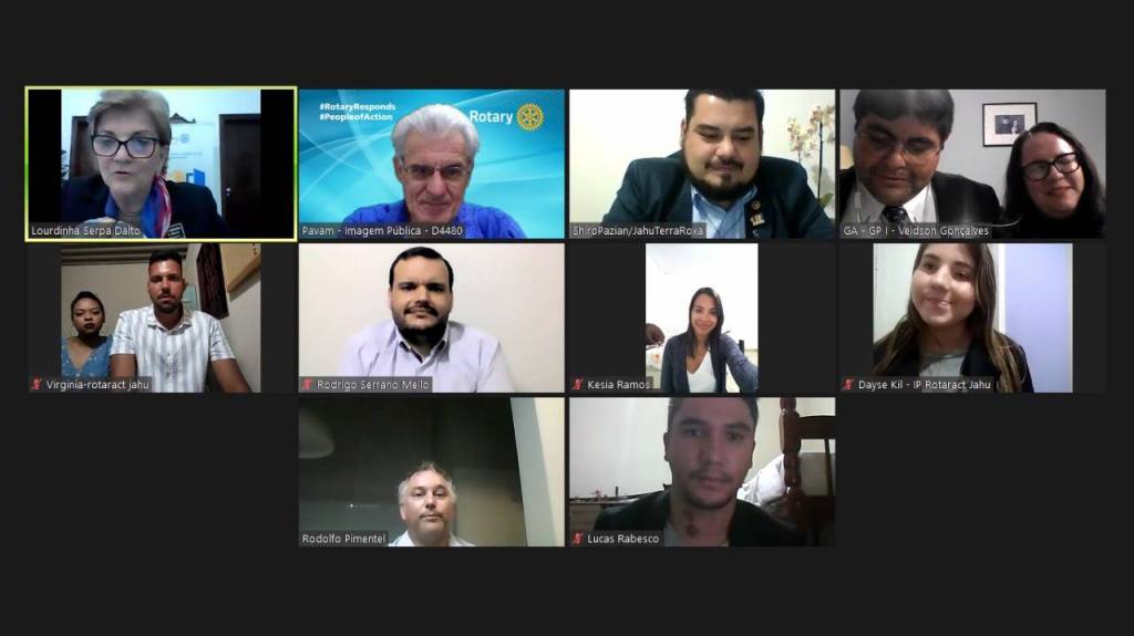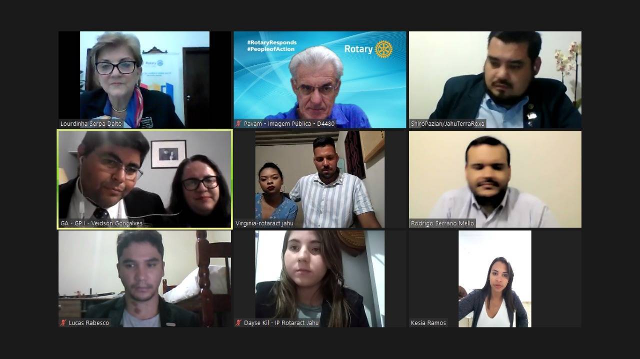 A governadora Lourdinha Dalto esteve em visita oficial virtual, no dia 28, ao Rotaract Club de Jahu Terra Roxa, para conhecer os jovens do clube e conhecer seus projetos. O clube, presidido por Luiz Macacari, tem vários projetos voltados para a comunidade, principalmente visando a juventude, entre os quais a campanha de doação de sangue. Também participaram da reunião o governador assistente Veidson Gonçalves e a esposa Brena; o chairman para Bolsas da Paz, Shiro Pazian; o representante do IIJ, Rodrigo Serrano Mello, e o presidente do Rotary Club de Jahu Terra Roxa, Rodolfo Pimentel. Presentes ainda os rotaractianos Dayse Kil, Késia Ramos, Lucas Rabesco e a protocolo Vigínia; além do diretor de Imagem Pública do Distrito, José Luiz Pavam. Parabéns.