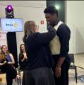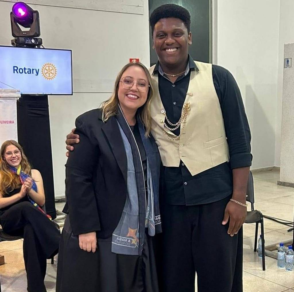 Foto com duas pessoas sorridentes: na esquerda temos uma jovem mulher de cabelos claros na altura dos ombros, usando óculos e roupa preta com um echarpe da nova gestão pendurado no pescoço. Abraçado a ela tem um jovem rapaz negro, vestindo roupa preta e um colete claro por cima. Atrás deles na lateral esquerda temos uma jovem sorridente, sentada batendo palmas. Atrás dela um pedestal preto com um foco de luz roxa no alto, trás uma tela plana com a palavra Rotary em azul e a roda rotária em amarelo num fundo azul claro. A seu lado esquerdo parte de um banner branco está pendurado na mesma. As paredes são clara e observamos também cadeiras vazias atrás. Uma porta de vidro fechada é vista atrás do rapaz. No canto inferior da foto no chão, podemos observar algumas garrafinhas plásticas de água.