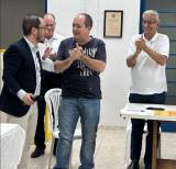 Foto com 2 homens sorridentes: o da esquerda veste camisa clara com blazer escuro, usa óculos, é semi calvo, tem barba e bigode e segura nas mãos um diploma de fundo amarelo com detalhes caramelo e azul marinho . A seu lado um rapaz de camiseta polo escura e calça jeans. Atrás deles uma parede branca acima e cinza abaixo, trás no centro acima uma roda rotária amarela com azul e abaixo dela um crucifixo prata. À frente da parede um pavilhão de bandeiras, onde a bandeira nacional está no topo em destaque.