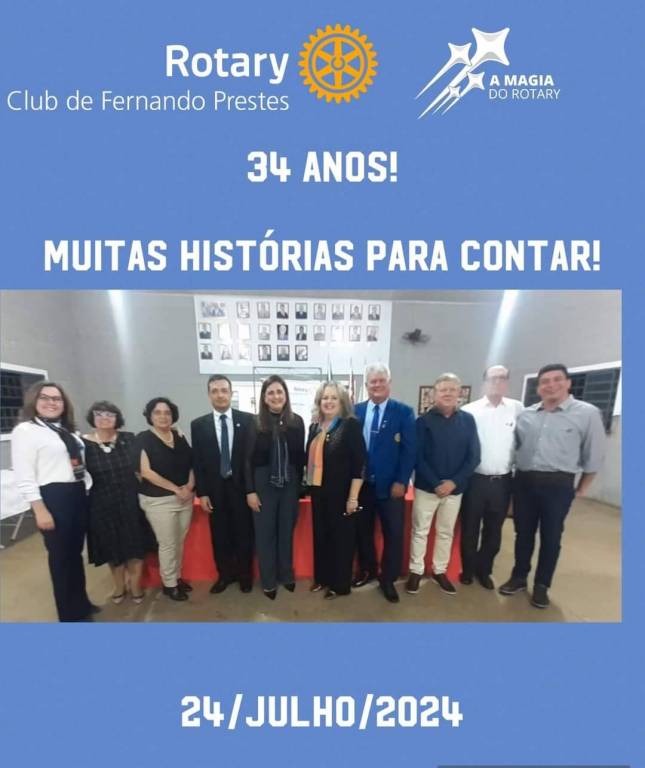 No dia 24 de julho de 2024, o Rotary Club de Fernando Prestes completa 34 anos de fundação, sob a presidência do Companheiro Romualdo Bertozzi/ Carla.