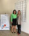 Foto com três mulheres sorridentes que estão lado a lado, sendo que a primeira tem cabelos longos escuros, veste calça jeans, blusa preta e tem um blazer azul jogado nos ombros. A terceira é loira de cabelos longos, veste calça e blusa pretas e tem um blazer bege por cima da blusa. A do centro está de saia preta e blusa verde e tem cabelos pretos na altura dos ombros. Atrás delas numa parede clara temos um banner grande fundo claro com várias logos iguais das Amigas Empreendedoras.