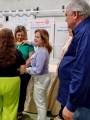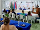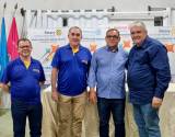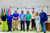 Foto com várias pessoas perfiladas lado a lado, sendo quatro mulheres e quatro homens. Dois homens vestem camisetas azul do Rotary e o restante estão vestidos de maneira esporte. Todos estão sorrindo discretamente. No fundo observamos duas janelas grandes encobertas com cortinas brancas sobre uma parede também branca.À frente das cortinas temos quatro banners rotários. No canto esquerdo temos um pavilhão de bandeiras e no canto direto uma tribuna de madeira com a roda rotária em destaque na frente. Atrás das pessoa uma mesa regangular exibe uma toalha bege. O lugar é fechado, está iluminado e o piso é claro.