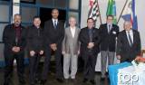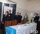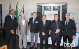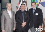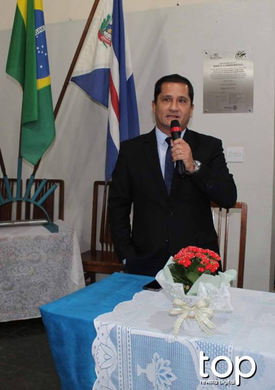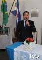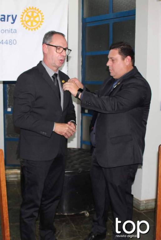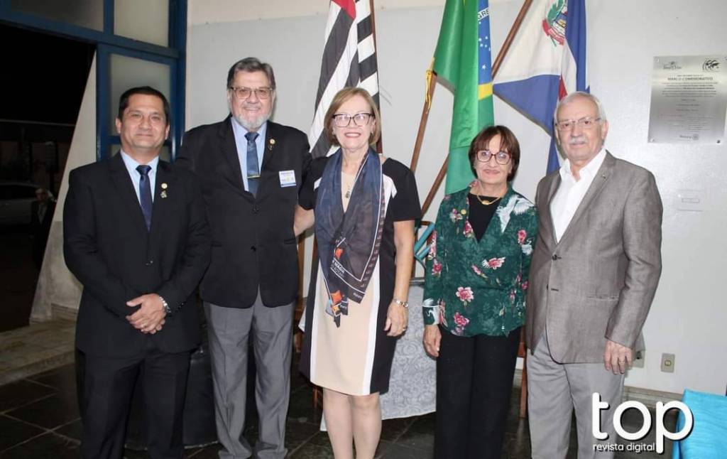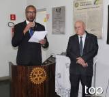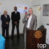Atrás deles no centro um banner do rotary Club de Barra Bonita em meio à vidraças grandes de ferro azul e no lado esquerdo um pavilhão com bandeiras e no direito em uma parede branca outro banner rotário. O lugar é fechado e está iluminado.