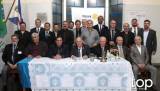 Foto com vários homens vestidos formalmente, a maioria de pé e outros sentados apoiados em uma mesa retangular com toalha azul por baixo e de renda branca por cima. Sobre a mesa um sino rotário, uma jarra de vidro pequena, copo de vidro, um vasinho pequeno de florzinhas rosa, alguns papéis e uma