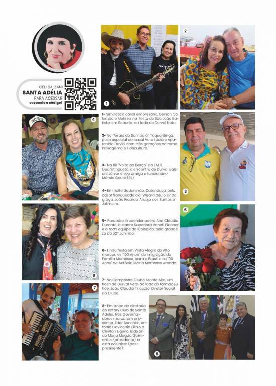 Página de uma coluna de jornal com fundo branco, trás no canto superior esquerdo um círculo com a foto de uma mulher vestido de vermelho com a mão no queixo, abaixo as informações: Celi Balzani - Santa Adélia - para acessar escanei o código! E ao lado um QR Code. Nessa página temos cerca de 8 fotos que estão posicionadas em forma de U nas laterais esquerda, acima e na direita. Elas trazem cenas de pessoas alegres, homens e mulheres em momentos de festa e de descontração. Bem no centro temos pautados assuntos enumerados conforme as fotos. Duas das fotos estão relacionadas à rotarianos: 1º - Em Assembleia Distrital do Rotary Club, na Unorte, Rio Preto, o encontro dessa colunista com a querida Gov. Sueli Kaiser e 5° - Assuntos e olhares descontraídos de Rafael Zanin (Imagem Pública) e Éder Bocchini (Gov Eleito 2024-25) do Rotary Club Distrito 4480, em dia de Assembleia.