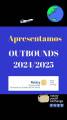 No card observamos duas tarjas pretas, uma na parte superior, onde temos o desenho de um aviãozinho decolando rumo ao globo terrestre desenhado em azul e verde; e outra na parte inferior, onde tem o logo colorido do Rotary Youth Exchange 4480. No centro, o card tem fundo azul escuro escrito em amarelo: Apresentamos, e escrito abaixo em branco: Outbounds 2024/2025. Abaixo dentro de uma tarja branca, temos o logo colorido do Rotary Club Noroeste do Estado de São Paulo e do lado escrito em três linhas: Rotary Youth Exchange (uma palavra abaixo da outra).