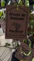 Na foto observamos, em evidência, um cartão amarrado no galho de uma muda com fita de cetim verde. Esses cartão é de tom terroso, escrito em preto: Árvore da Amizade. Pau Brasil. Soluções Ambientais, telefone 17 3442 5589. O fundo está ofuscado, mas é possível observar várias mudas e outros cartões pendurados em galhos.