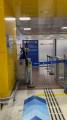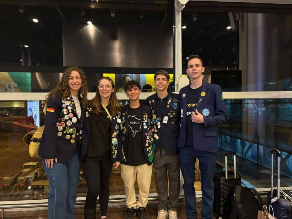 Na foto observamos um ambiente amplo com paredes altas em tons claros. Na frente ocupando quase todo o espaço da foto, temos a imagem de meio corpo, sendo da esquerda para a direita: um homem vestindo camiseta de gola polo azul com logo colorido do Rotary; uma jovem com casaco azul escuro de intercambista, repleto de botons, com camiseta branca, um homem com camiseta em tom laranja, uma jovem usando óculos, com camiseta preta e estampa branca; e uma mulher com camisa branca e calça roxa. Todos sorridentes olhando para a camêra.