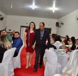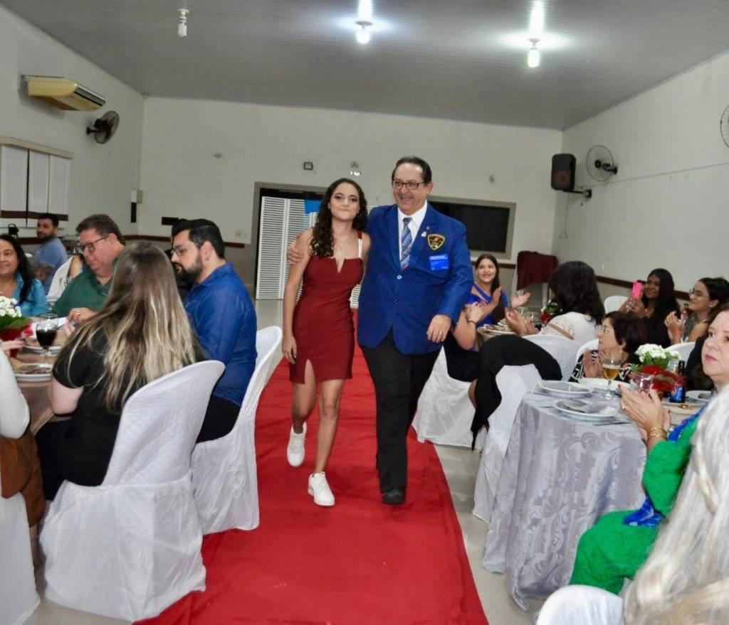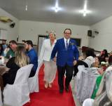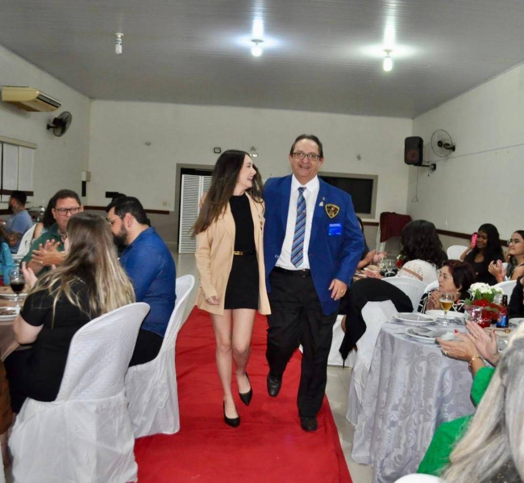 Na foto observamos um ambiente fechado com paredes brancas, onde do lado esquerdo e do lado direito tem mesas com toalhas brancas. Há várias pessoas sentadas. Temos o casal Governador Eder Bochini e Nelly entrando de mãos dadas, pelo tapete vermelho no centro da foto. Ele vestindo terno azul marinho, calça e sapatos pretos, camisa branca com gravata azul com o lema A Magia do Rotary, ela na esquerda da foto vestindo um casaco branco, com calça branca, echarpe com o Lema A Magia do Rotary. Estão sorridentes e sendo aplaudidos. Na mesa observamos pratos e taças. O ambiente é iluminado, possui ar condicionado a esquerda e ventilador na esquerda e direita. Há uma caixa de som fixada no alto da parede.