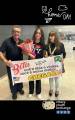 Na foto observamos um espaço amplo com paredes cinzas e piso em tons beje claro. Temos um homem usando óculos com camiseta com gola polo preta e calça de moletom azul marinho. Do seu lado, uma jovem vestindo camiseta preta, calça preta e calçado branco, segurando com seu braço direito um bouquet de flores coloridas embalado em papel e laço rosa. Do lado direito uma mulher com cabelos castanhos escuros soltos, casaco em tom escuro e calça branca, com sapatos preto. Estão segurando uma faixa com moldura nas beiradas onde está escrito em vermelho Beta. Na faixa temos a imagem no centro do desenho de um avião e a bandeira do Brasil na direita. Abaixo está escrito em preto: Entre idas e vindas, você é nossa melhor chegada! A palavra "chegada" está escrito em amarelo com moldura preto para dar destaque a palavra. No canto inferior esquerdo temos a bandeira dos EUA.