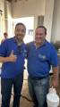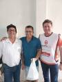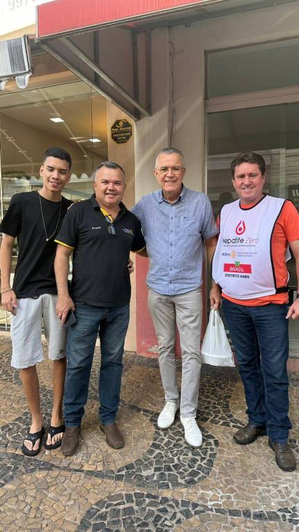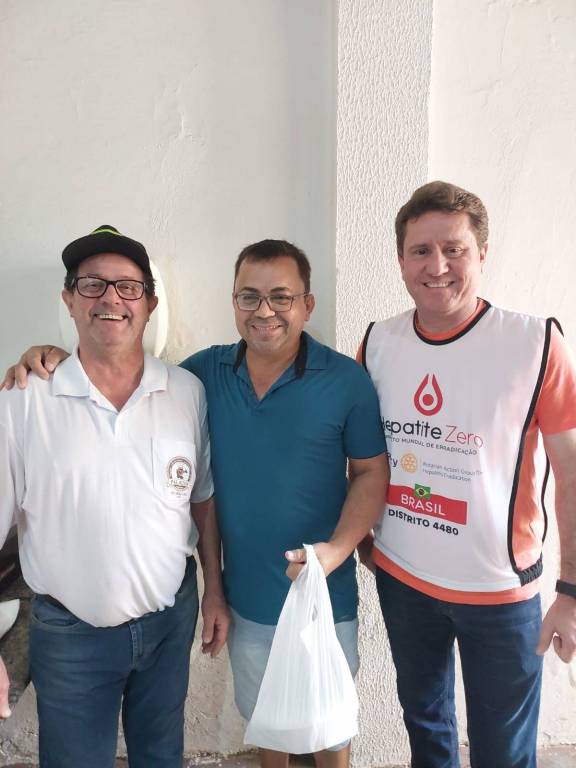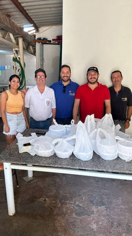 Na foto observamos um espaço fechado com paredes amarelo claro, com cinco homens posicionados para frente, todos sorrindo, vestindo da esquerda para a direita, camiseta com gola polo vermelha, camiseta branca da campanha Hepatite Zero Distrito 4480, camisetas com gola polo branca, azul e logo colorida do Rotary, preta com o logo colorido do Rotary. Na frente deles muitas sacolas brancas, que estão com as marmitas de feijoada dentro.