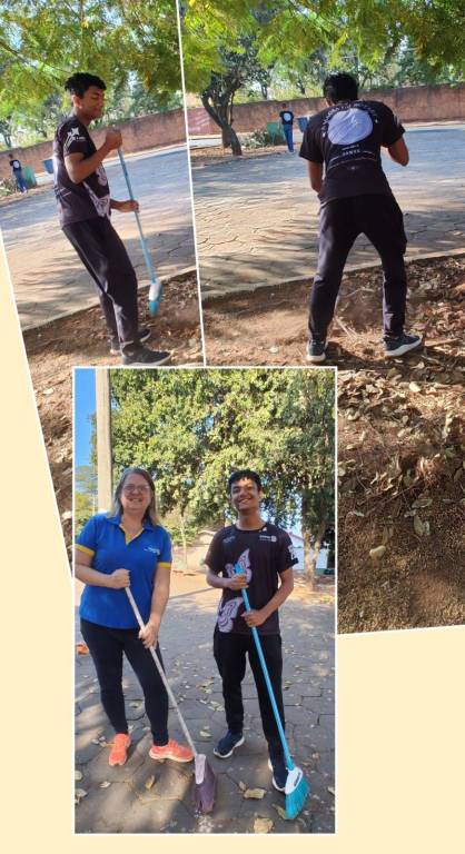 Na foto observamos um ambiente aberto, arborizado, com cinco jovens vestindo camiseta preta, com logo branco do Interact Club de Barretos. Todos estão com vassouras e pá de lixo. Do lado dos jovens temos um homem com cabelos grisalhos e óculos de sol, vestindo moletom azul marinho e camiseta azul, bermuda jeans,