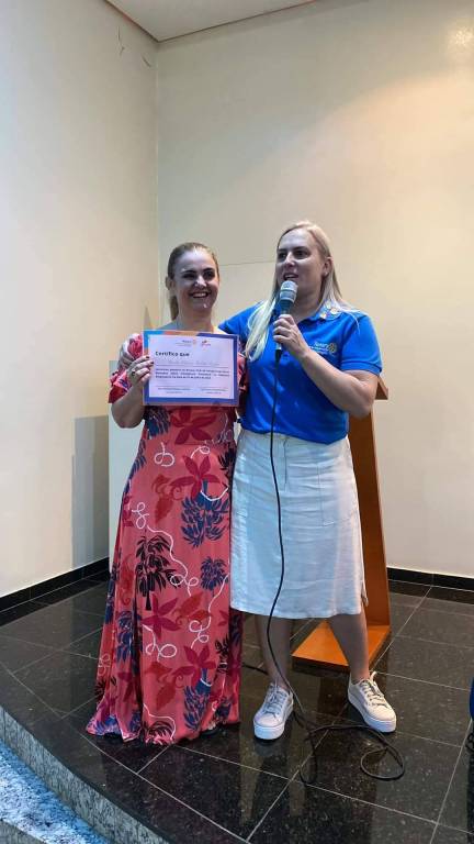 Na foto observamos um espaço fechado, com parede bege claro e piso preto. Encostado nessa parede no centro da foto, temos o banner branco pendurado no suporte de alumínio, com o logo colorido do Rotary Club de Votuporanga - Novas Gerações. Abaixo escrito em azul: Aila Cristina Nicoletti Otterço e abaixo a identificação escrito em vermelho: Presidente 2024-25. Abaixo centralizado em tamanho maior o logo colorido A Maria do Rotary. Abaixo escrito em azul Eder Pedro Artur Bocchini / Nelly, identificado em vermelho logo abaixo: Governador 2024-25 - Distrito 4480. Abaixo escrito em azul Stephanie A. Urchick e identificado escrito em vermelho: Presidente 2024-25 do Rotary International. Do lado esquerdo desse banner observamos uma mulher com cabelos loiros claros abaixo dos ombros, vestindo uma camiseta com gola polo azul com o logo colorido do Rotary Club de Votuporanga - Novas Gerações. Ela está usando uma saia abaixo dos joelhos na cor bege claro e tênis. do lado direito do banner temos uma mulher usando óculos. Ela está usando um vestido vermelho com estampadas de folhagens nas cores azul, preto e vermelho, Ela está segurando a frente dela, um certificado do Rotary. Atrás dela observamos duas bandeiras, sendo uma delas do Brasil.