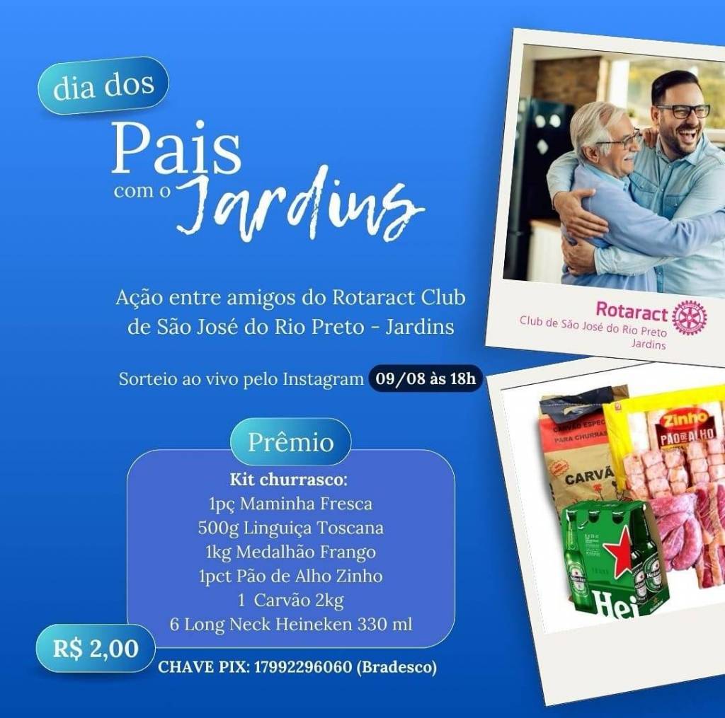 No card com fundo azul observamos duas molduras na lateral direita, uma abaixo da outra, com fundo branco, onde a primeira tem dois homens abraçados e sorrindo, usando óculos e camisa com manga comprida em tons de azul, abaixo da foto o logo colorido do Rotaract Club de São José do Rio Preto - Jardins. Abaixo a foto de um pacote de carvão, um gradado de heineken, pacote de pão de alho e carne para churrasco. Na lateral esquerda escrito em branco: Dia dos Pais com o Jardins, Ação entre amigos do Rotaract Club de São José do Rio Preto - Jardins, sorteio ao vivo pelo instagram 09 de agosto às 18 horas. Prêmio: Kit Churrasco: 1 peça de Maminha Fresca, 500 gramas de linguiça toscana, 1 kg de Medalhão de Frango, 1 pacote de pão de alho zinho, 1 carvão 2 kg e 6 long neck heineken 330 ml. R$ 2,00 Chave Pix 17992296060 Bradesco. O kit churrasco, as palavras: dia dos e o valor de R$ 2,00 estão dentro de uma moldura fina na cor branca com um azul de tom diferente do fundo do card.