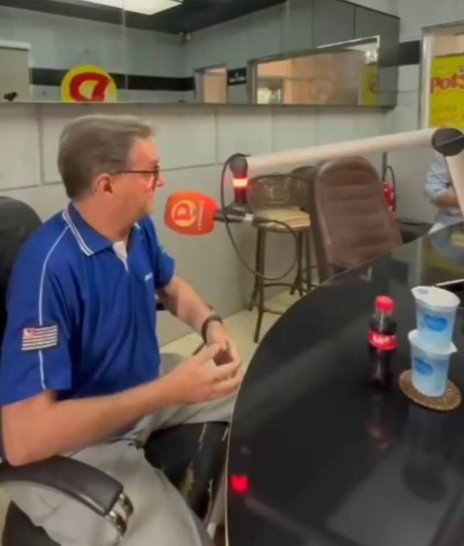 Na foto observamos um ambiente fechado, com paredes revestidas na cor cinza e piso beje claro. Há um espalho ocupando a parede do fundo, onde na frente tem um homem com camiseta com gola polo azul escuro com o logo colorido do Rotary Club de Santa Fé do Sul. Ele usa óculos, é calvo com cabelos grisalhos, e está usando uma calça cinza claro e relógio preto no braço esquerdo. Ele está sentado com os braços apoiados nos braços da cadeira giratória preta. Tem um microfone apoiado com suporte suspenso, ele tem proteção laranja com o logo da Rádio Dinâmica. Há uma outra cadeira executiva giratória marrom escuro e do lado direito desta cadeira observamos o braço de um homem que parece estar sentado na lateral. No canto direito tem um pedaço da mesa, com vidro escuro, onde eles está sentados ao redor. Abaixo dos espelhos observamos também uma cadeira alta, com encosto baixo, de ferro e estofado em tons terrosos.