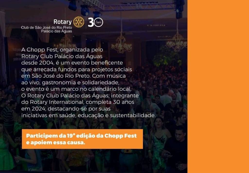 Olá pessoal, o Rotary Club de São José do Rio Preto - Palácio das Águas está organizando no dia 21/09, no Monte Líbano, a 19º Choppfest.