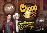 Card com fundo amadeirado trás na lateral esquerda um círculo marrom com as informações em letras brancas dentro: 21 Set Clube Monte Líbano 13h as 20h. Ao lado em uma esfera maior temos a palavra Chopp em amarelo bem destacado. Seguindo abaixo da palavra chopp uma caneca grande cheia de chopp e em vermelho ao lado a palavra Fest - 19° edição. Na lateral esquerda a foto de uma dupla sertaneja, um deles de cabelos escuros, vestindo camiseta cinza com jaqueta vinho por cima e o outro de camiseta branca com blusa preta e chapéu branco de caubói na cabeça. Ao lado da dupla em letras amarelas temos: