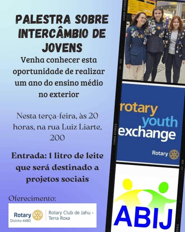 No card com fundo azul claro, observamos escrito em preto na metade vertical do card: Palestra Sobre Intercâmbio de Jovens. Venha conhecer esta oportunidade de realizar um ano de ensino médio no exterior. Nesta terça-feira, às 20 horas, na rua Luiz Liarte, 200. Entrada: 1 litro de leite que será destinado a projetos sociais. Oferecimento (logotipo colorido dentro de uma tarja retangular na cor branco do) Rotary Club de Jahu - Terra Roxa. Na lateral direita levemente inclinado, a foto de três jovens com o uniforme de intercambista; no meio, a imagem do logo do Rotary Youth Exchange e por fim, o logo do ABIJ.