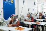 Na foto observamos um ambiente com teto alto, paredes brancas, mesas de costura brancas com maquinas da mesma cor. na parede a esquerda da foto tem um painel em tecido azul escuro com o logo colorido do Rotary 2440 Bolge. Estão sentadas na frente de três mesas que observamos mais a frente, uma atrás da outra, três mulheres vestindo seus hijabs com blusas de manga comprida, manuseando as maquinas.