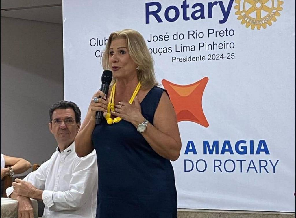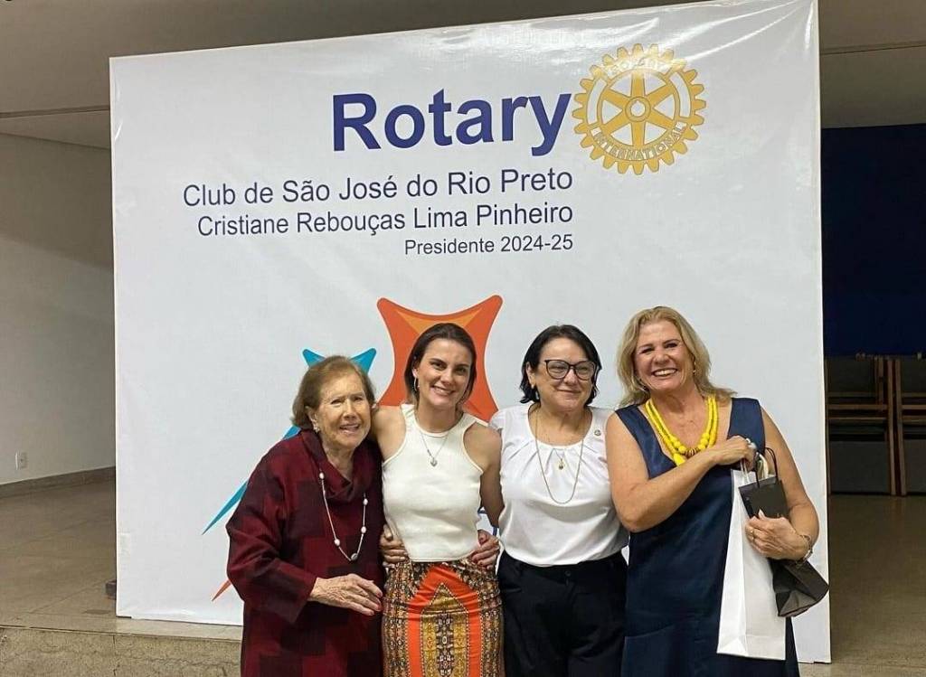 Na foto observamos um ambiente fechado, onde no fundo observamos uma parede azul marinho e nas laterais paredes brancas. Tem várias cadeiras guardadas no fundo da foto, onde na frente delas temos um banner comprido do logo colorido do Rotary Club de São José do Rio Preto. Abaixo o nome Cristiane Rebouças Lima Pinheiro. Presidente 2024-25 e abaixo o Logo colorido brande da Magia do Rotary. Na frente uma mesa com toalha bege claro, com dois homens sentados e três mulheres entre eles, sentadas com as mãos sobre a mesa que tem o sino rotário e um arranjo com folhas.