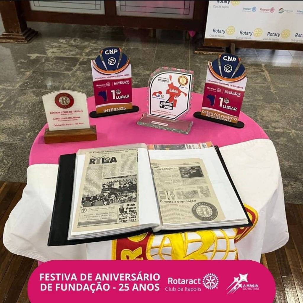 Festiva de Aniversário de Fundação - 25 anos. Seguindo para a direita o símbolo do Rotaract Club de Itápolis e a logo da gestão atual A Magia do Rotary.