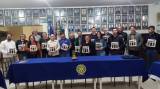 Foto com várias pessoas entre homens e mulheres posicionados atrás de uma grande mesa retangular com toalha azul que trás a roda rotária bem no centro. Todos tem nas mãos uma caixa de papelão branco decorada. Ao fundo em uma parede branca temos uma grande galeria de fotos quase tomando toda a parede. Na lateral esquerda observamos uma passagem com porta de vidro que dá acesso a outro cômodo do lugar. É noite e as luzes iluminam o salão.