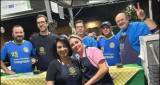 Foto com várias adultos entre homens e mulheres sorridentes posicionados, na frente agachados e atrás de pé. Todos estao vestidos de maneira esporte e a maioria está de agasalho. O lugar é aberto, é noite, o local estão bem iluminado por lâmpadas e eles estão protegidos por uma enorme tenda clara que tem como base hastes de ferro e alumínio. Atrás deles observamos um banner branco grande com várias logomarcas em sua extensão. O chão é de grama.