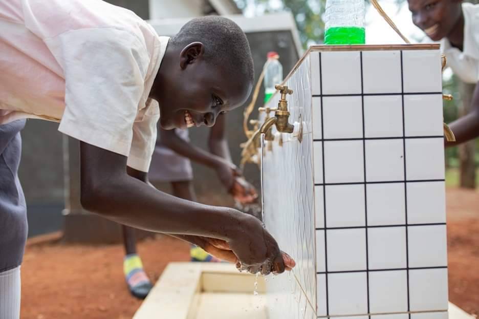 Foto de um garoto negro sorridente vestindo camisa clara e bermuda escura. Ele está curvado para frente lavando as mãos em uma torneira que está ao lado de outras várias que pertencem a um sistema azulejado de branco em um local aberto. Observamos que nas outra torneiras pertencentes a essa estrutura existem outras crianças fazendo uso da água. O chão é de terra batida. Em cima da estrutura de azulejos temos dois frascos com líquido verde.
