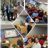 Card com uma montagem de cinco fotos, posicionadas de forma que a foto do centro está em losango. A primeira foto do lado esquerdo acima trás quatro mulheres e um homem sorridentes posando à frente de alguns arbustos em local fechado; na foto acima lado direito que foi tirada do fundo para a frente temos pessoas sentadas em uma auditório de cadeiras vermelhas assistindo uma palestra com três pessoas à frente e um grande telão; na foto abaixo da esquerda temos o foco no telão e algumas pessoas a seu lado; na foto do canto inferior direito pessoas sentadas nas poltronas vermelhas do auditório e na foto do centro três mulheres de pé e perfil, apoiadas em uma mesa de madeira com cadeiras pretas atrás.