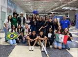 Na foto observamos várias pessoas entre homens, mulheres e jovens no ambiente de aeroporto com teto alto de estrutura metálica e piso quadrado bege claro e preto alternados. Eles estão posicionados de frente para a câmera e da esquerda para a direita, estão segurando um cartaz escrito em verde azul e amarelo: Bem vindo ao Brasil Nádia, uma faixa com as bandeiras do México e Brasil e uma bandeira do Brasil. Estão todos sorrindo.