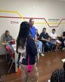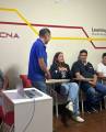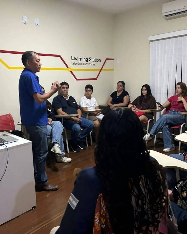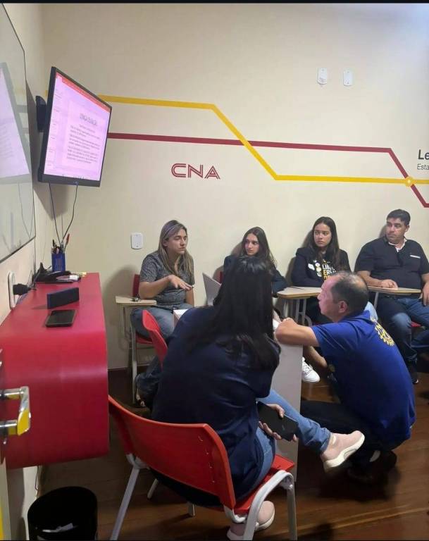 Foto desfocada trás quatro pessoas ao fundo sentadas em cadeiras universitárias e um de pé ,onde três são homens e duas mulheres. Somente a segunda pessoa que é um homem de traços orientais que está de pé gesticula com a mão direita. Os que estão sentados estão encostados em uma parede bege com decoração de linhas vermelha e amarela acima das siglas em vermelho CNA e prestam atenção no homem de pé. Ao lado do homem que está de pé temos uma mesa pequena branca com um notebook em cima e uma cadeira vermelha. No lado direito na parede acima das linhas vermelha e amarela temos em letras azuis Learming Stat e abaixo algo que não compreendemos. O lugar é fechado e está iluminado.