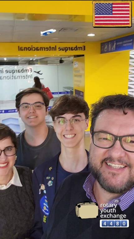 Abaixo no canto direito temos o desenho de uma malinha bege com a inscrição em branco ao lado: rotary youth exchange e abaixo quatro quadradinhos azuis com os números 4480 em branco