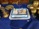 Foto com dois casais elegantemente vestidos, super sorridentes, posicionados atrás de uma mesa decorada com toalha azul com rodas rotárias na frente em amarelo e uma faixa em amarelo no lado direito. Sobre a mesa no centro um bolo de aniversário quadrado decorado em branco e azul com várias rodas rotárias sobre ele, balões brancos e dourados, um sino rotário, um vaso com flores. Atrás deles da esquerda para a direita numa parede verde temos parte de um aparelho de ar condicionado. Ainda atrás no centro numa parte amadeirada da parede temos uma tv plana ao alto e no lado direito um banner rotário.