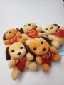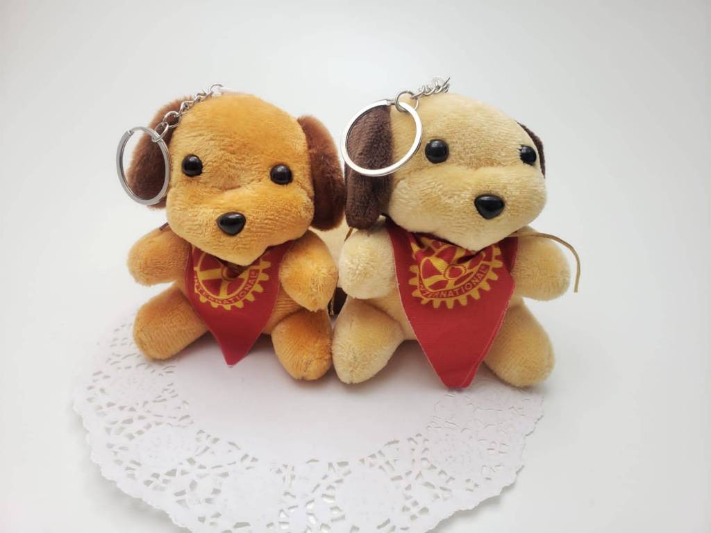 Foto de dois chaveiros de cachorrinho: o primeiro é caramelo e tem uma gravatinha vermelha com a roda rotária em amarelo no pescoço, o segundo é bem parecido ao primeiro, o que muda é a cor que é mais clara. Eles tem na cabeça uma corrente e o elo em prata pra pendurar chaves. Eles estão sobre uma toalhinha rendada branca de papel.