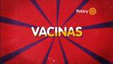 Card com fundo vermelho e com traços azuis escuro saindo do centro pra fora, traz bem no meio em branco e amarelo a palavra Vacinas. No canto superior direito o símbolo do Rotary.