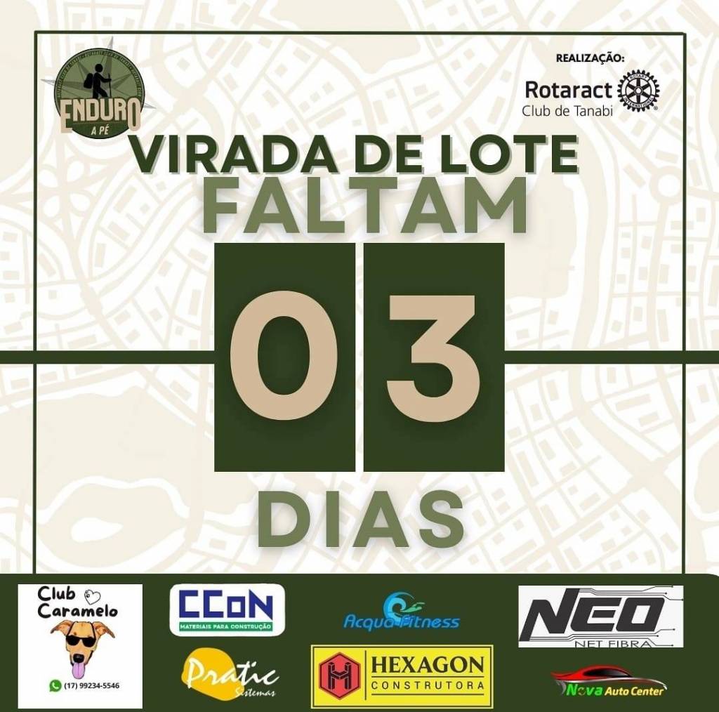 No card com fundo branco e riscos transparentes que demonstram um trajeto, temos na parte superior esquerda, um logo com tons em verde, em círculo escrito: Enduro a pé. Do lado superior direito temos escrito: Realização e abaixo o logo do Rotaract Club de Tanabi. Escrito com letras grandes em preto e verde escuro, centralizado: Virada de Lote. Faltam 03 dias, onde o número três está com tamanho ainda maior, no fundo verde escuro, escrito em bege claro. Abaixo uma tarja com fundo verde escuro, com os logos do Club Caramelo, CCON, Pratic, Hexagon Construtora, Neo Net Fibra e Nova Auto Center. Há uma moldura fina verde escuro em volta do card. onde no centro tem uma linha um pouco maior na horizontal que vai de um lado até o outro.
