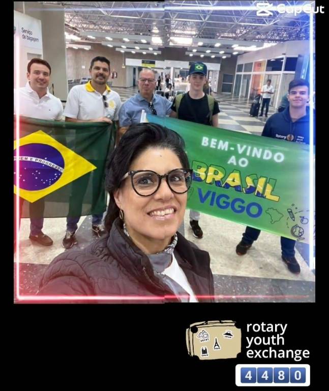 Selfie tirada por uma jovem mulher sorridente, de cabelos escuros, usando óculos e agasalho, posicionada no centro da foto. Atrás dela cinco homens, sendo que dois são adolescentes. Eles seguram nas mãos uma bandeira do Brasil e ao lado uma faixa de fundo verde com a inscrição em letras coloridas: Bem vindo ao Brasil Viggo. O ambiente é de aeroporto, com seu piso, iluminação e divisorias características. Acima na foto no lado direito o símbolo em branco do CapCut. Abaixo na direita fora da foto em uma faixa preta temos uma malinha bege com as palavras em branco ao lado: rotary youth exchange e abaixo em quadrinhos azuis temos os números 4480 em branco.