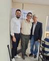Foto com três homens. Da esquerda para a direita um jovem de barba e bigode, vestindo camisa social branca e calça preta; a seu lado um senhor de óculos, camiseta bege e calça cinza e por último um senhor grisalho, usando óculos, de camisa branca com blazer preto e calça jeans. Todos estão sorrindo. Eles estão em um lugar fechado, com paredes claras e atrás deles existe um banner rotário em um pedestal. Podemos observar no lado direito da foto parte de uma pessoa sentada em uma cadeira de ferro escura. Outros objetos que não identificamos compõe a cena.