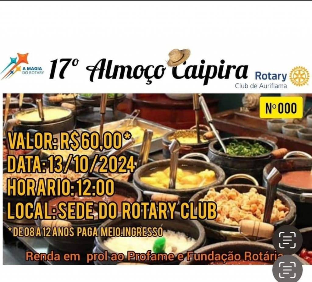 Card com fundo branco trás acima da esquerda para a direita a logo colorida da gestão atual A Magia do Rotary, ao lado em letras pretas 17° Almoço Caipira (sendo que a letra C tem um chapéu bege preso nela) e na direita o símbolo do Rotary Club de Auriflama.