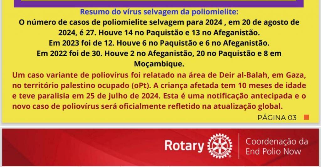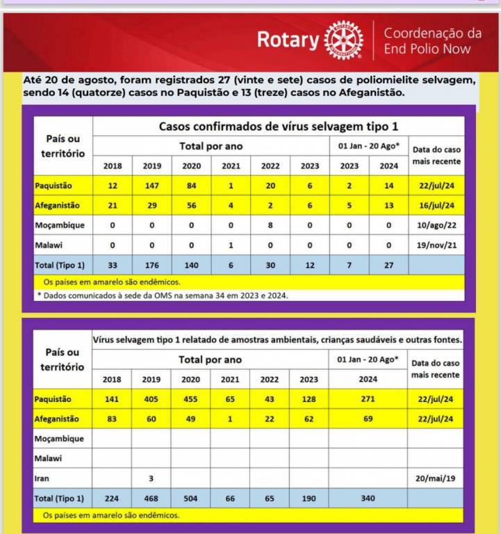 Abaixo em uma faixa fina clara temos em letrinhas pretas: Até 30 de agosto, foram registrados vinte e sete casos de poliomielite selvagem, sendo catorze casos no Paquistão e treze casos no Afeganistão. Abaixo temos emolduradas duas tabelas separada com linhas largas roxas. Nelas países da África e Ásia com seus respectivos casos de poliomielite dos anos de 2018 a 2024. Tanto na tabela de cima como na de baixo Paquistão e Afeganistão estão marcados de amarelo significando serem países endêmicos.
