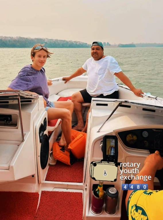 Na foto com o fundo de um rio extenso, onde mais distante temos na beira do rio plantação que ocupa quase todo o espaço horizontal da imagem, temos na frente um jovem com óculos na cabeça, cabelos curtos loiro, vestindo uma camiseta na cor lilás e short jeans, ele está pisando em um colete na cor laranja "salva vidas"e um homem na direita vestindo camiseta branca, bermuda preta, boné verde pra trás. encostado na lancha branca. Dá para observar uma pessoa vestindo camiseta amarelo e verde dirigindo a lancha. O fundo da lancha é revestido com um carpete vermelho. Abaixo do lado direito o logotipo do Rotary Youth Exchange 4480.