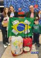 Na foto em ambiente fechado com parede de fundo quadriculado pequeno em vários tons de azul e no chão piso quadriculado grande nas cores preto e bege, temos uma jovem com casaco de intercambista azul com um vaso com flores na mão, vestindo calça preta e tenis branco com cadarço azul. Ela está abraçada com um mulher vestindo um paletó preto, com blusa azul claro e gola branca, está com uma das mãos segurando a bandeira do brasil, escrito seja bem vinda, te amamos Franchesca, Brasil corações Argentina, Te amamos. E do lado direito um homem com poucos cabelos, usando óculos com uma das mãos apoiadas nas costas da mulher e a outra mão segurando a ponta da bandeira. Ele usa um casaco verde militar e camisa com botões na frente na cor rosa claro. Na frente dele uma criança vestindo moletom verde escuro escrito California na frente, e calça de abrigo azul escuro com tênis azul escuro. Na frente da bandeira tem duas malas, uma com imagens diversas e outra vermelha, ambas com rodinhas. Abaixo do lado direito, está o logo colorido do Rotary Youth Exchange 4480.