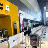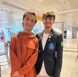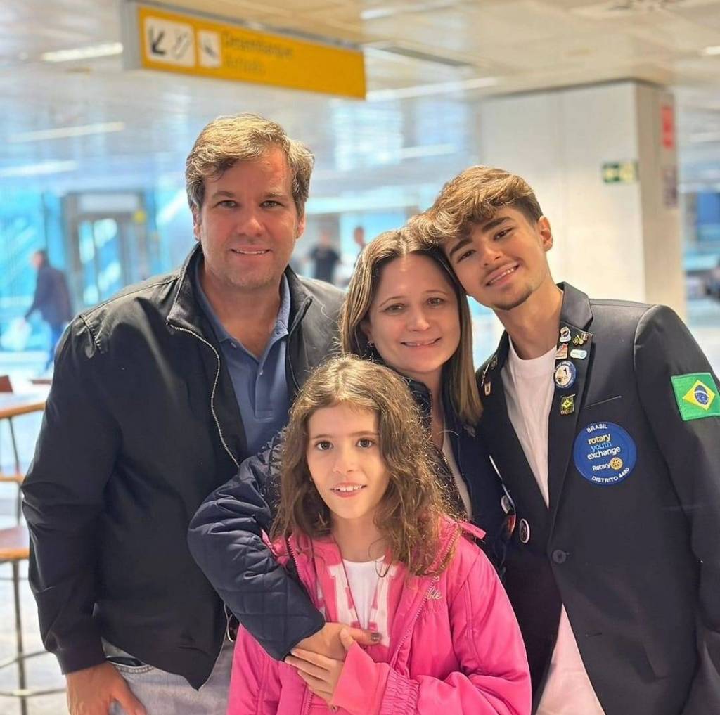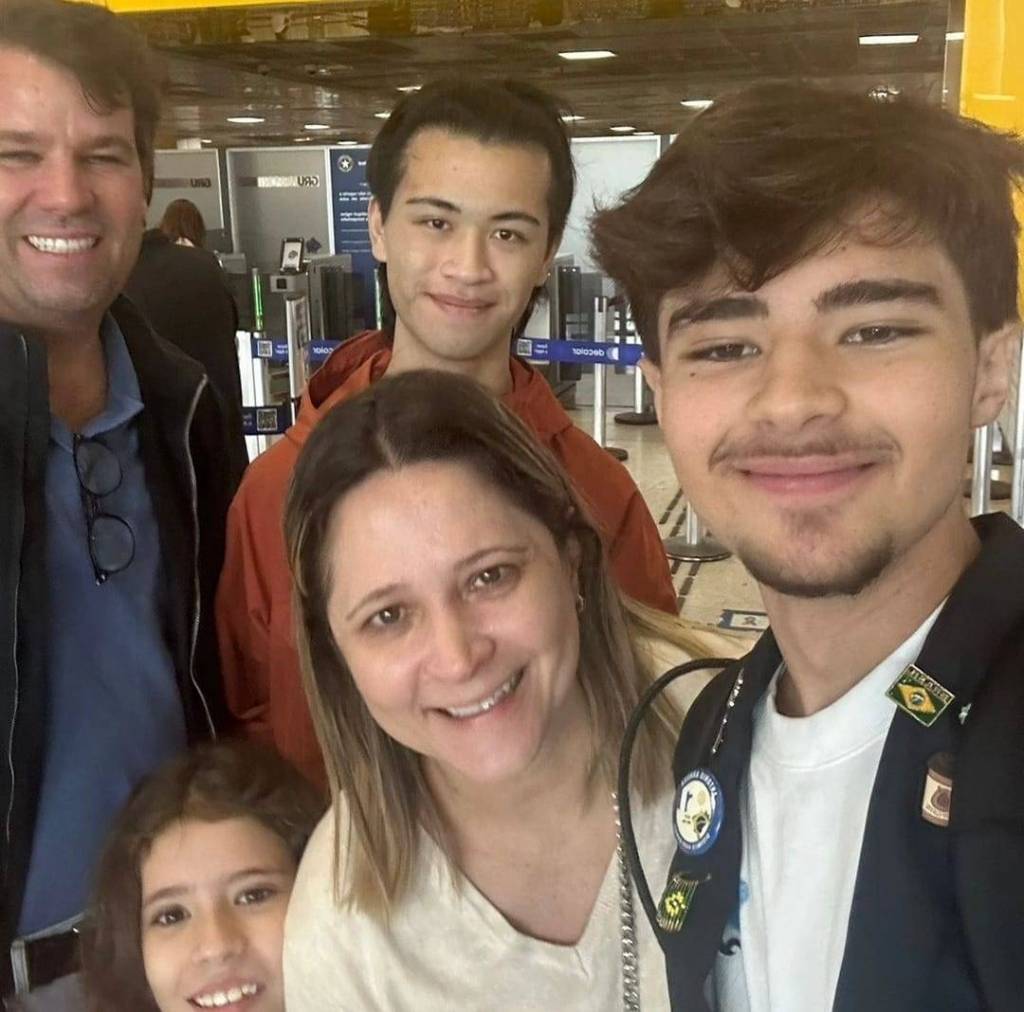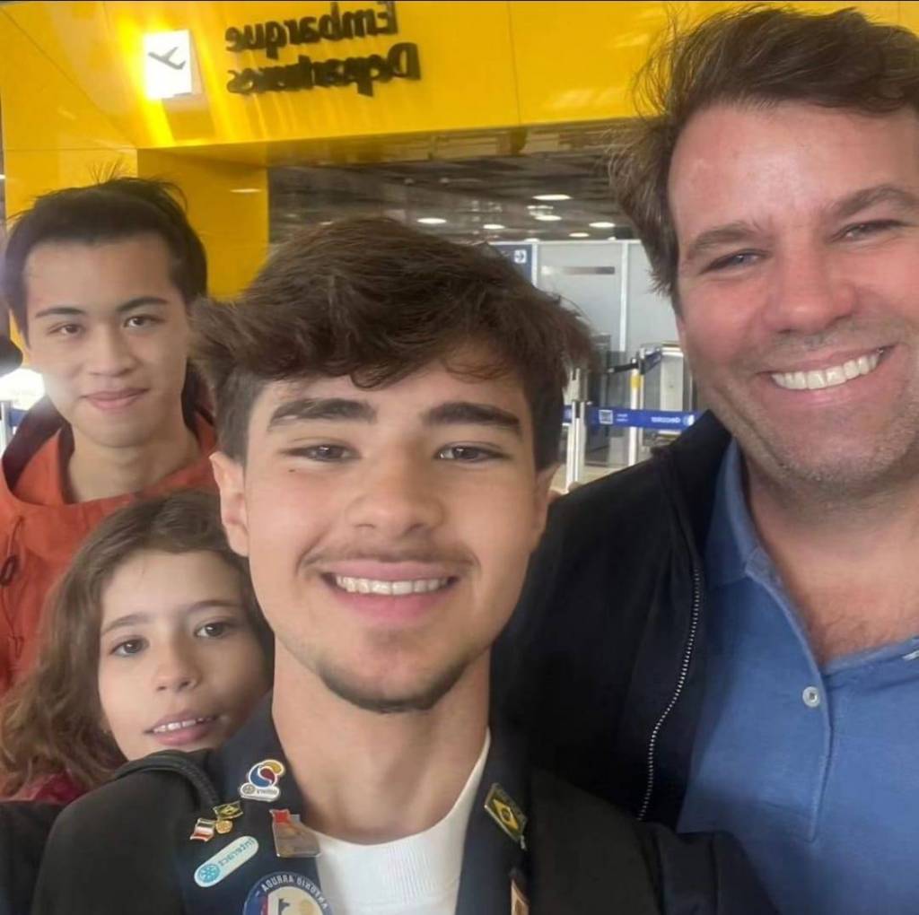 Foto de um jovem intercambista vestido com o característico blazer azul com bottons, camiseta branca e calça clara. Ele está posicionado no corredor de embarque de um aeroporto com sua arquitetura usual, divisorias, painéis explicativos, etc.