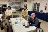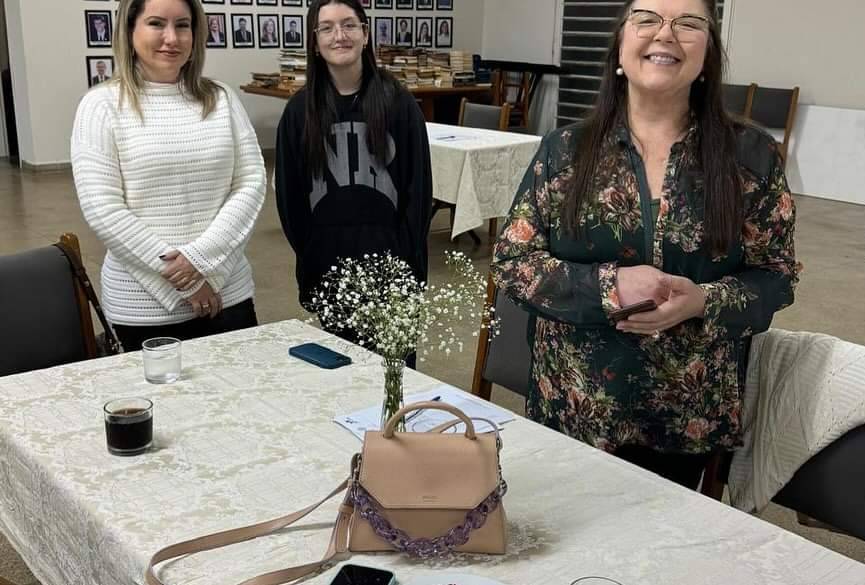 Foto de quatro pessoas, sendo três mulheres e um homem. Todos vestem agasalho de inverno. Eles estão posicionado atrás de uma mesa retangular com toalha bege clara acompanhada de cadeiras escuras e sobre a mesa, o sino e o martelo rotários, um vaso fino com flores delicadas, um microfone, papéis e caneta. As duas mulheres que estão na direita trazem nas mãos folhas de papel branca e a última delas faz uso de um microfone com a mão direita levado à boca.