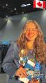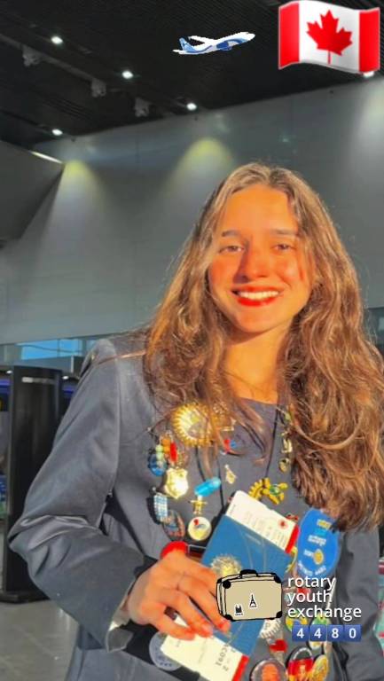 Foto com 4 pessoas, sendo que na lateral esquerda temos um senhor grisalho usando calça jeans e agasalho preto, seguindo para a direita uma jovem loira de jeans e agasalho cinza está abraçada a uma outra jovem intercambista com seu blazer cheio de bottons e calça amarela e por fim uma jovem sorridente de jeans e camiseta branca. O ambiente é de aeroporto e atrás deles observamos uma grande painel de voos.Acima do meio do card para a direita temos um aviãozinho levantando voo até o desenho de uma bandeira do Canadá. Abaixo na lateral direita temos o desenho de uma malinha bege com os dizeres ao lado em letras brancas rotary youth exchange e abaixo dentro de quatro quadradinhos azuis os números 4480 em branco.