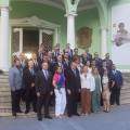 Foto tirada de perfil esquerdo de várias pessoa entre homens e mulheres, onde os homens estão de terno e as mulheres vestidas de esporte social . Eles estão posicionados na escadaria externa de uma suntuosa construção de paredes verde e branca com pilares e arabescos clássicos. É dia e a porta do local ao fundo está aberta.
