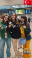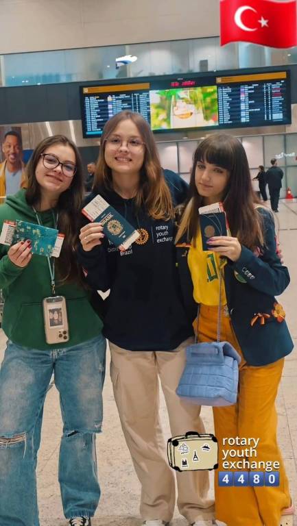 Foto com quatro pessoas: da esquerda para direita um homem sorridente usando óculos, uma jovem de óculos usando uniforme de intercambista, uma senhora loira também usando óculos e sorrindo e por último uma garota jovem também usando óculos e de cabelos no ombro. O ambiente é de aeroporto e acima na foto temos um aviãozinho decolando rumo a uma bandeira da Turquia.