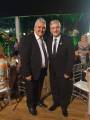 Na foto observamos um ambiente amplo, arborizado, com várias pessoas sentadas e outras em pé, todos elegantemente vestidos. Na frente, posicionados para a foto, dois homens estão em pé, vestindo terno preto, camisa branca e gravata em tons de azul escuro. Ambos tem cabelos grisalhos e usam sapatos pretos. Estão sorrindo. As cadeiras tem assento branco e são feitas de material claro. O piso do ambiente é em tons de marrom. O ambiente está iluminado e bem decorado.