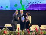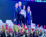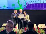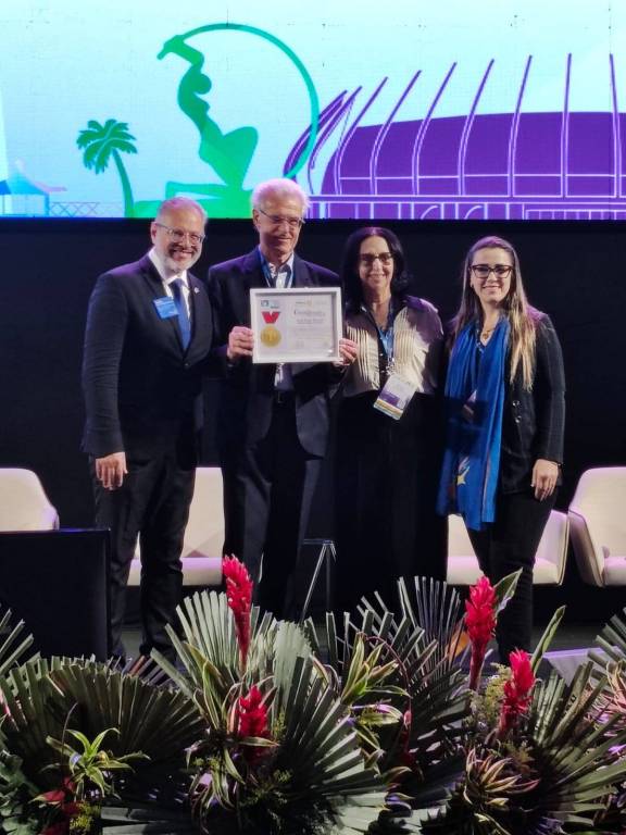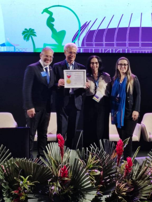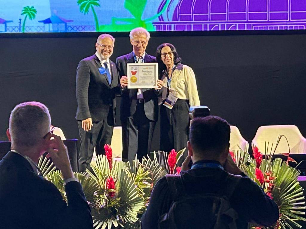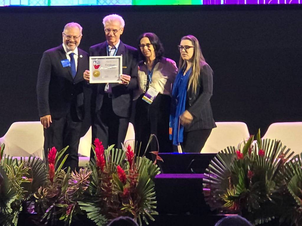Na foto observamos, da esquerda para a direita, um homem com cabelos grisalhos, calvo, usando óculos, vestindo um terno preto, camisa branca e gravata azul escuro, está fazendo um sinal de jóia com a mão direita; no meio um homem com cabelos grisalhos, usando óculos, vestindo um terno preto, camisa branca, está segurando um certificado em suas mãos e a direita uma mulher vestida com camisa com manga longa em tons claros, usa óculos e tem cabelos no ombro pretos. Todos estão sorrindo. No fundo o painel colorido em tons de azul.