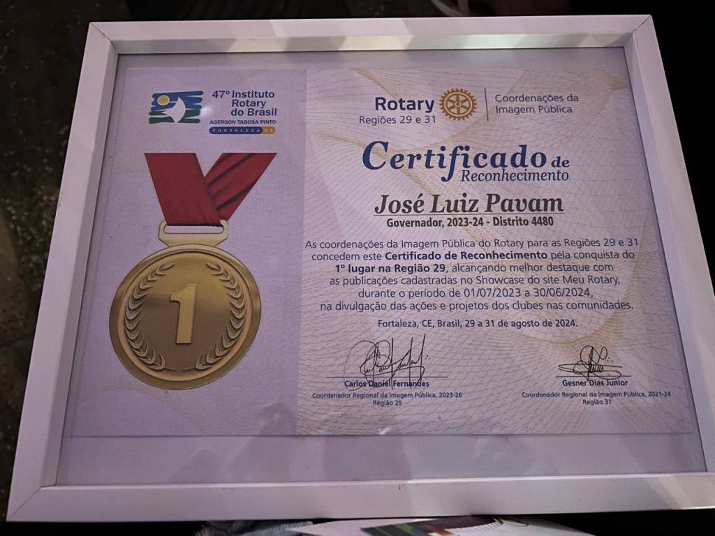 "O Distrito 4480 foi premiado, nesta manhã do dia 31 de agosto, no Instituto Rotary do Brasil, em Fortaleza-CE, com o primeiro lugar em Imagem Pública da Região 29. Trabalho coordenado pelo Pres. da Comissão, Rafael Zanin."